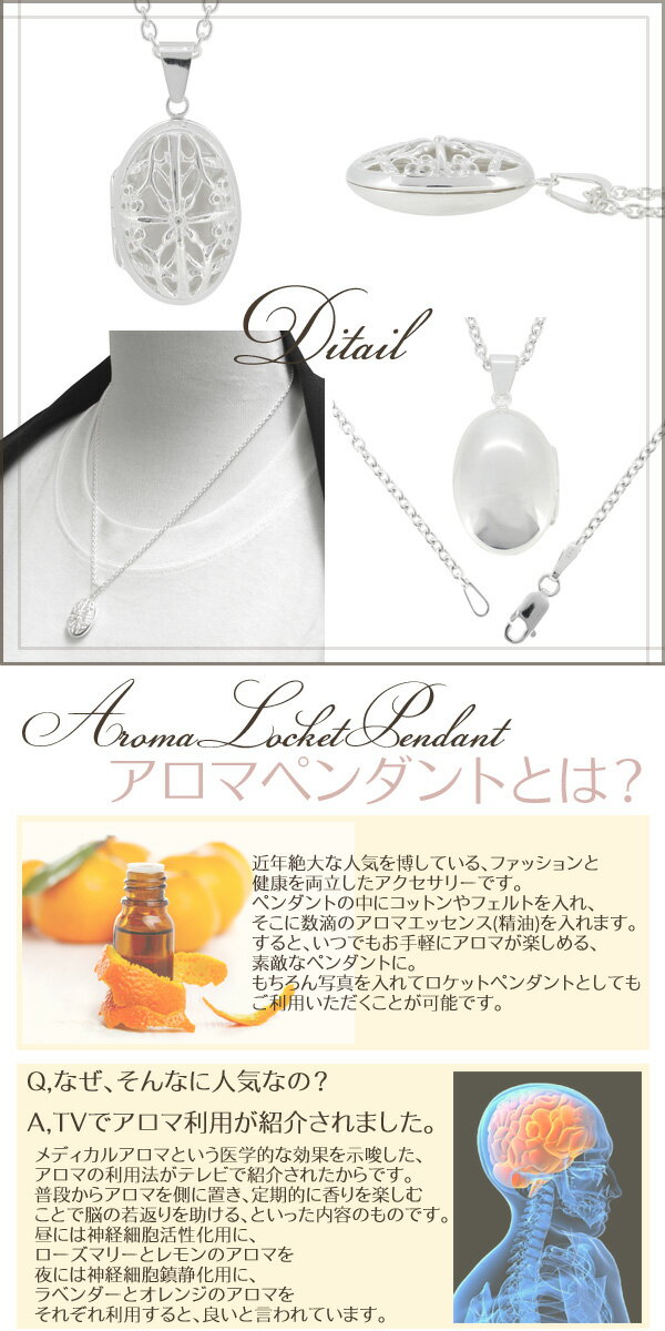 現在非常に人気のある、アロマロケットペンダントとして活躍してくれます! また、思い出のある大切な写真を収めるロケットや、小ぶりなペンダントとして、オシャレにも活躍してくれるアイテム! 『アロマロケットペンダント』としての御使用 アロマロケットペンダントとは、見た目は通常のロケットペンダントと同じですが、アロマオイルや香水などを染み込ませたコットンやフェルトに入れて使用するペンダントのことです。