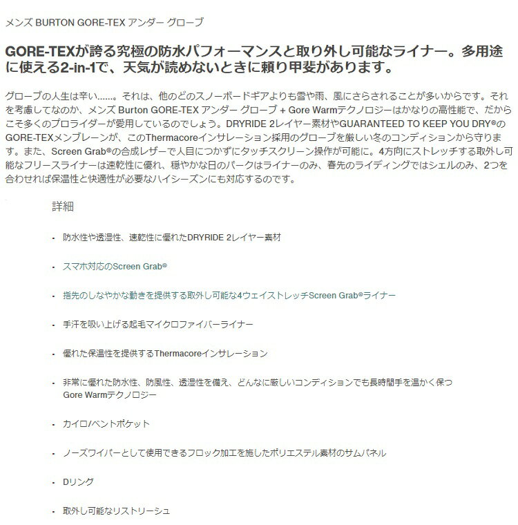 バートン BURTON メンズ GLOVES MB GORETEX UNDER GLOVE ゴアテックス アンダーグローブ